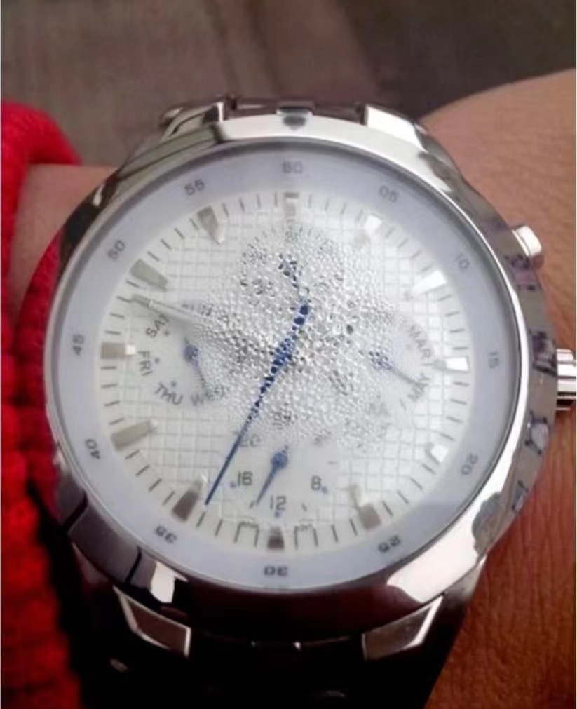 解决过程:技师迅速将手表拆解开,并发现防水垫圈失效导致水分渗入内部。将防水垫圈更换并进行必要的清洁和干燥处理。重新组装后进行防水测试,确保手表恢复正常的防水性能。